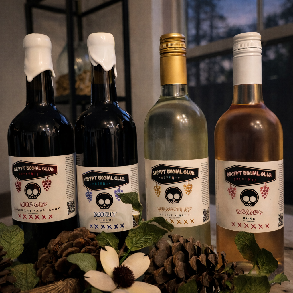 The Crypt Social Club 4-Pack is the perfect way to experience the lineup — a curated bundle featuring four signature bottles from the Crypt. Built for sharing, collecting, and celebrating with the skeleton family.